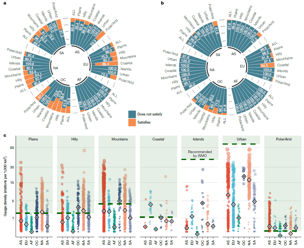 在全球气候变化的背景下,降水观测是理解水循环过程、评估水资源安全以及应对极端气候风险的基础。然而,全球降水观测网络的覆盖水平和布局合理性长期以来缺乏系统的评估。依托青海师范大学与北京师范大学在水文气象与地理科学领域的长期合作,研究团队系统整合了1900年至2022年间约22万个逐日降水观测站的数据,其中约4万个站点符合长期稳定观测条件,被归类为“长时序”站点。该研究首次在全球范围内量化评估了降水观测网络的覆盖状况。研究结果表明,目前全球仅约13.4%的陆地面积达到了世界气象组织推荐的最低站点密度标准;而如果仅考虑“长时序”站点,这一比例进一步下降至1.9%,突显了全球降水观测能力的显著短板。